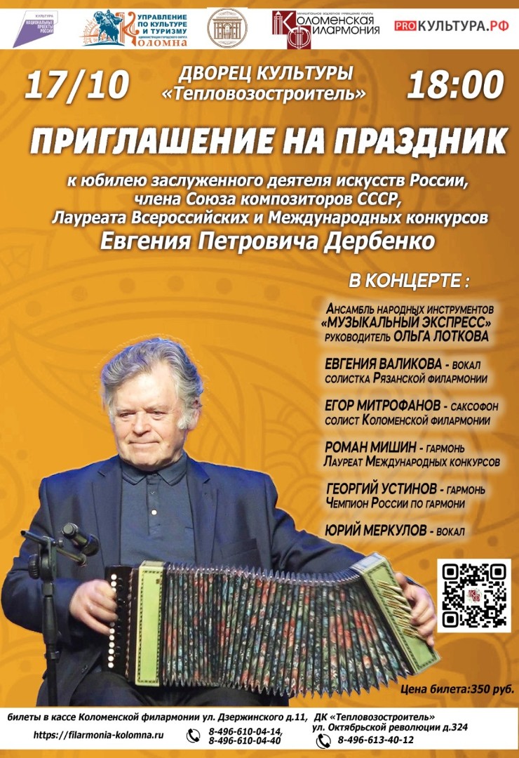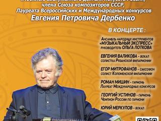 Каждый авторский концерт заслуженного деятеля искусств Российской Федерации Евгения Петровича Дербенко, уходящий корнями в русское народное творчество, интересен широкому кругу зрителей и становится действительно «Приглашением на праздник».