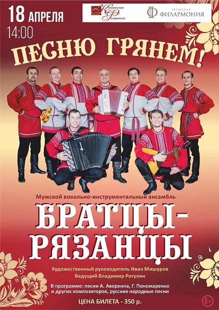 18 апреля в 14.00 ч. Коломенская филармония приглашает посетить концерт коллектива «Братцы-Рязанцы» – мужской песенно-инструментальный ансамбль Рязанской филармонии.