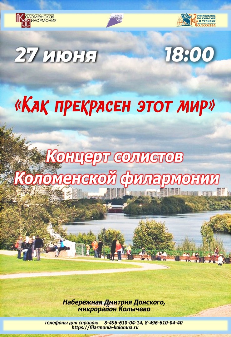27 июня в 18.00 ч. ждём вас на живописном берегу реки Оки в микрорайоне Колычево. Концерт состоится при благоприятных погодных условиях.