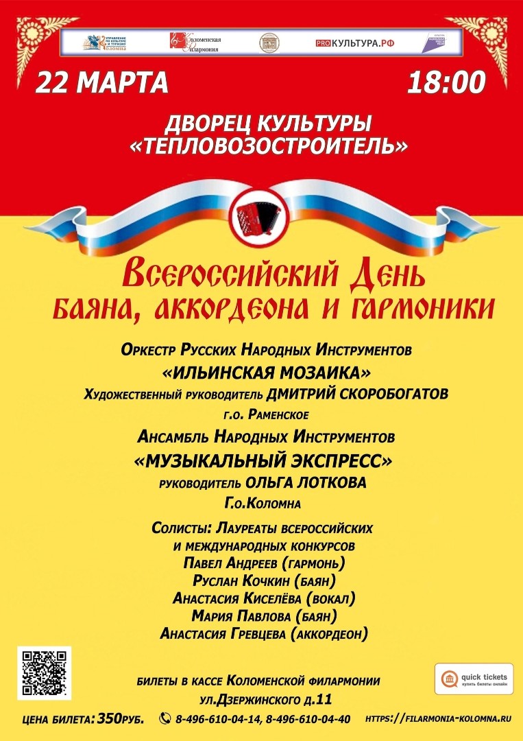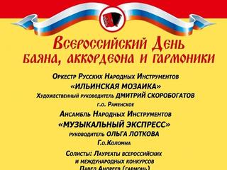 22 марта в 18.00 ч. по инициативе Коломенской филармонии в ДК "Тепловозостроитель" состоится праздничный концерт, посвящённый Всероссийскому Дню баяна, аккордеона и гармоники.