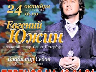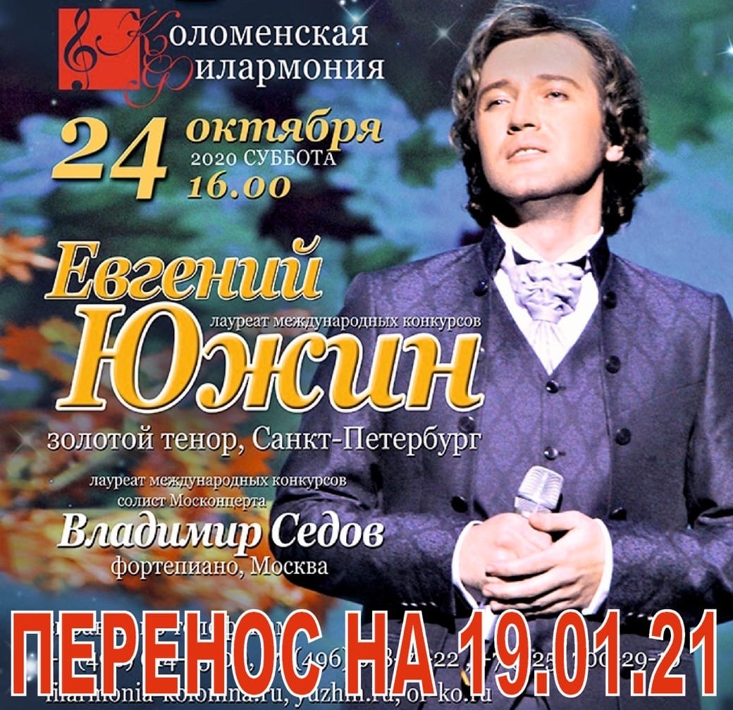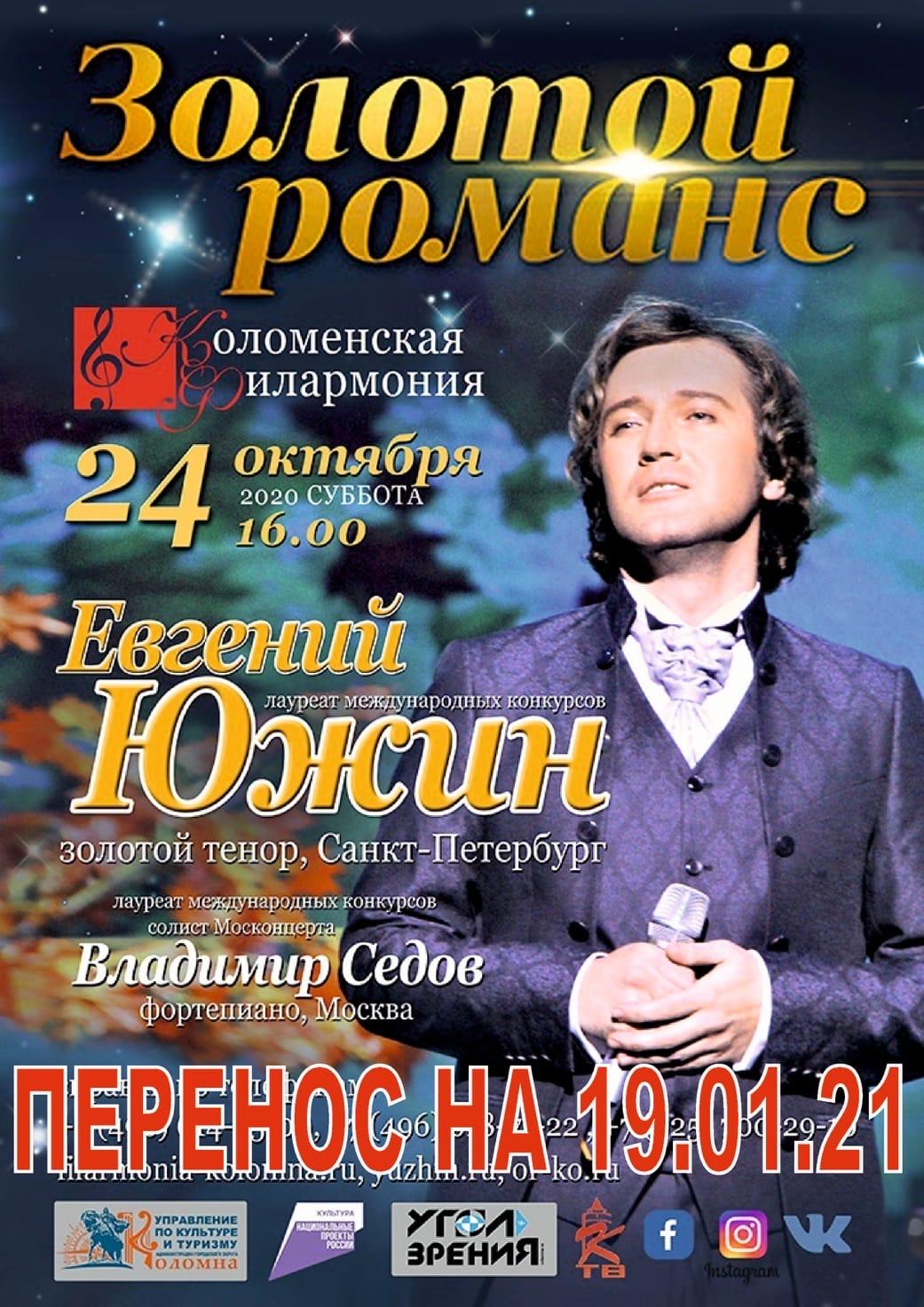 24 октября в 16.00 ч. Коломенская филармония приглашает в свой концертный зал любителей золотого романса. В нашем городе выступит Евгений Южин — петербургский певец и артист, лауреат множества международных конкурсов. Участник телепроекта «Главная сцена».