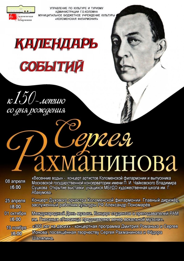 В 2023 году российское общество и вся прогрессивная мировая общественность будет отмечать это год, как год музыки великого русского композитора серебряного века Сергея Рахманинова. Специальный Указ о праздновании 150-летия этого композитора был издан Президентом РФ ещё 29 января прошлого года. Мероприятия по случаю 150-летия композитора будут проводится и в нашем городе. Коломенская филармония предлагает вашему вниманию концерты, которые будут проводиться в течении 2023 года.