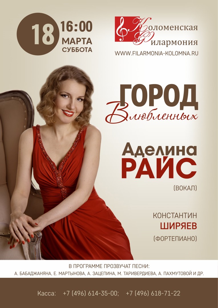 18 марта 16.00 ч. Коломенская филармония приглашает на концерт "Город влюбленных" в исполнении российской певицы Аделины Райс.