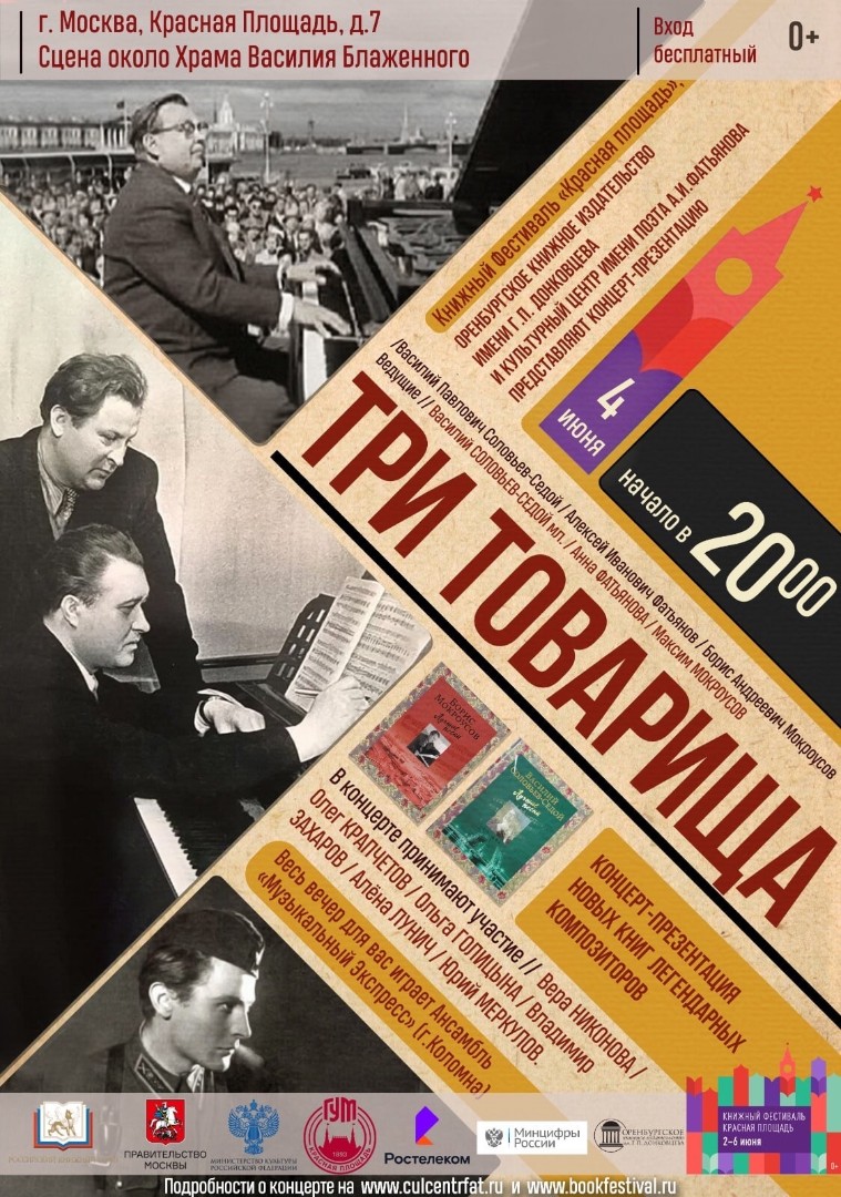 Внимание! Внимание! Внимание! У нас прекрасная новость!!!! Красная площадь 4 июня 2023! Книжный Фестиваль «Красная площадь». В 20.00 на Главной сцене около Храма Василия Блаженного будет звучать прекрасная программа-презентация «Три товарища». Творческая команда Культурного центра им А. Фатьянова и Ансамбль народных инструментов Коломенской Филармонии «Музыкальный экспресс» представят песни трёх великих авторов: Василия Соловьева-Седого, Алексея Фатьянова и Бориса Мокроусова. Приходите будем петь! Вход свободный.