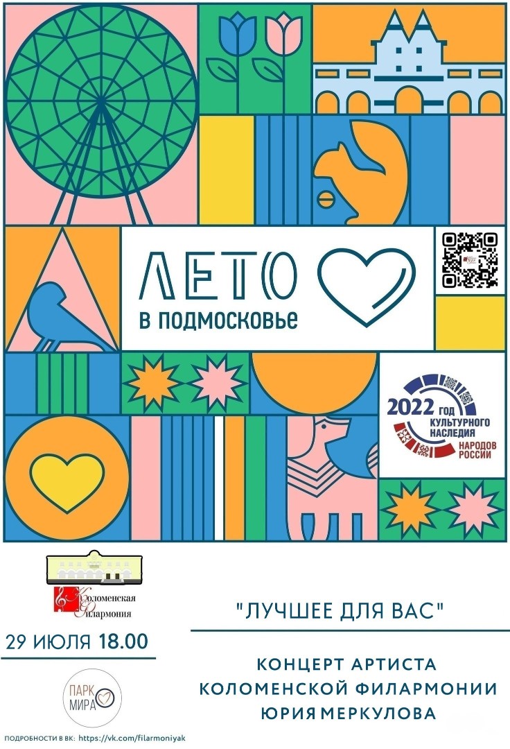 29 июля в 18.00 ч. состоится концерт артиста Коломенской филармонии Юрия Меркулова. Юрия давно полюбила коломенская публика за его профессионализм и душевное исполнение музыкальных произведений. Голос артиста стал визитной карточкой городских мероприятий.