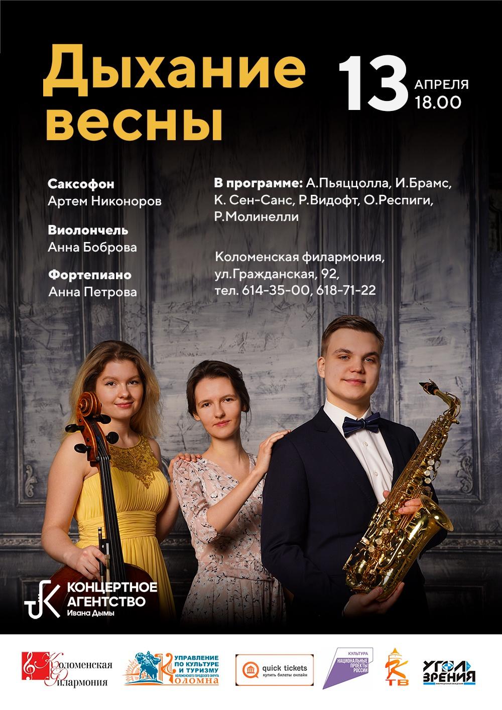 13 апреля в 18.00 ч. в зале Коломенской филармонии состоится концерт для любителей классической музыки. Зрителей ожидает уникальная программа с участием саксофониста Артема Никонорова, который несмотря на юный возраст уже успел выступить на различных площадках в городах России, Болгарии, Финляндии, артистки театра Геликон-опера Анна Боброва (виолончель); лауреат международных конкурсов Анна Петрова (фортепиано).