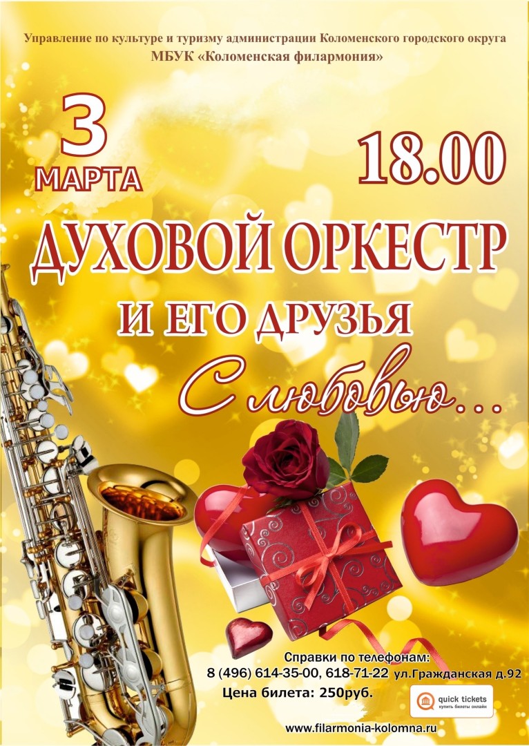 3 марта 2023 г. в 18.00 ч. Состоится концерт Духового оркестра, под управлением заслуженного работнику культуры РФ Александра Пономарева. Любовь! Какой разной она бывает: мучительной, волнующей, обжигающей, счастливой и роковой. В концертной программе прозвучат произведения, слушая которые, невозможно не вспомнить о первом поцелуе, о запахе весенней листвы, о радости встреч и расставаний.