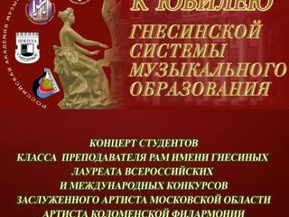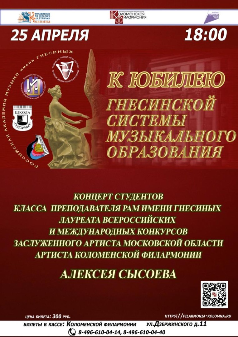 25 апреля в 18.00 ч. в зале Коломенской филармонии состоится концерт к юбилею Гнесинской системы музыкального образования. Для коломенцев выступят студенты класса преподавателя РАМ им. Гнесиных, заслуженного артиста Московской области, солиста Коломенской филармонии Алексея Сысоева.