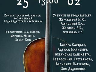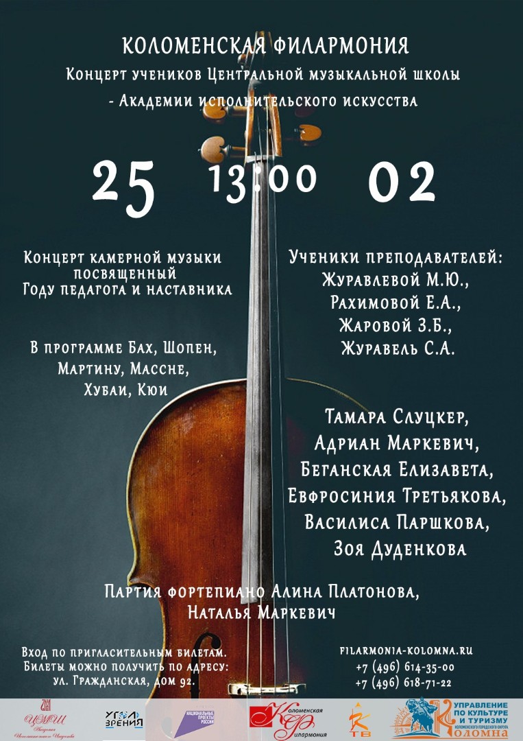 25 февраля в 13.00 ч. Коломенская филармония приглашает на концерт камерной музыки. 2023 год Указом президента объявлен Годом педагога и наставника. На сцене филармонии выступят учащиеся Центральной музыкальной школы Академического исполнительского искусства г. Москва, класс преподавателей Журавлевой М.Ю., Рахимовой Е.А., Жировой З.Б., Журавель С.А.