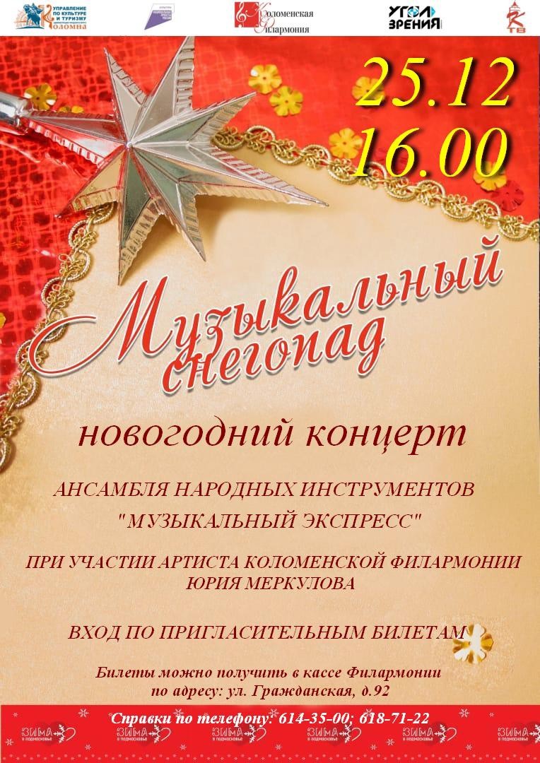 25 декабря в 16.00 Коломенская филармония приглашает вас на новогодний концерт «Музыкальный снегопад» ансамбля народных инструментов «Музыкальный экспресс».