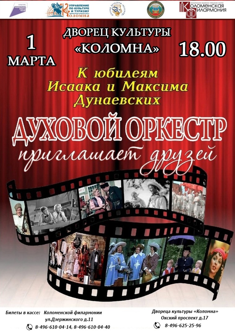 1 марта 2025 года в 18.00 ч. Духовой оркестр Коломенской филармонии под управлением Главного дирижёра заслуженного работника культуры РФ Александра Пономарёва приглашает вас во Дворец культуры «Коломна» на концерт, посвящённый творчеству музыкальной династии Дунаевских.
