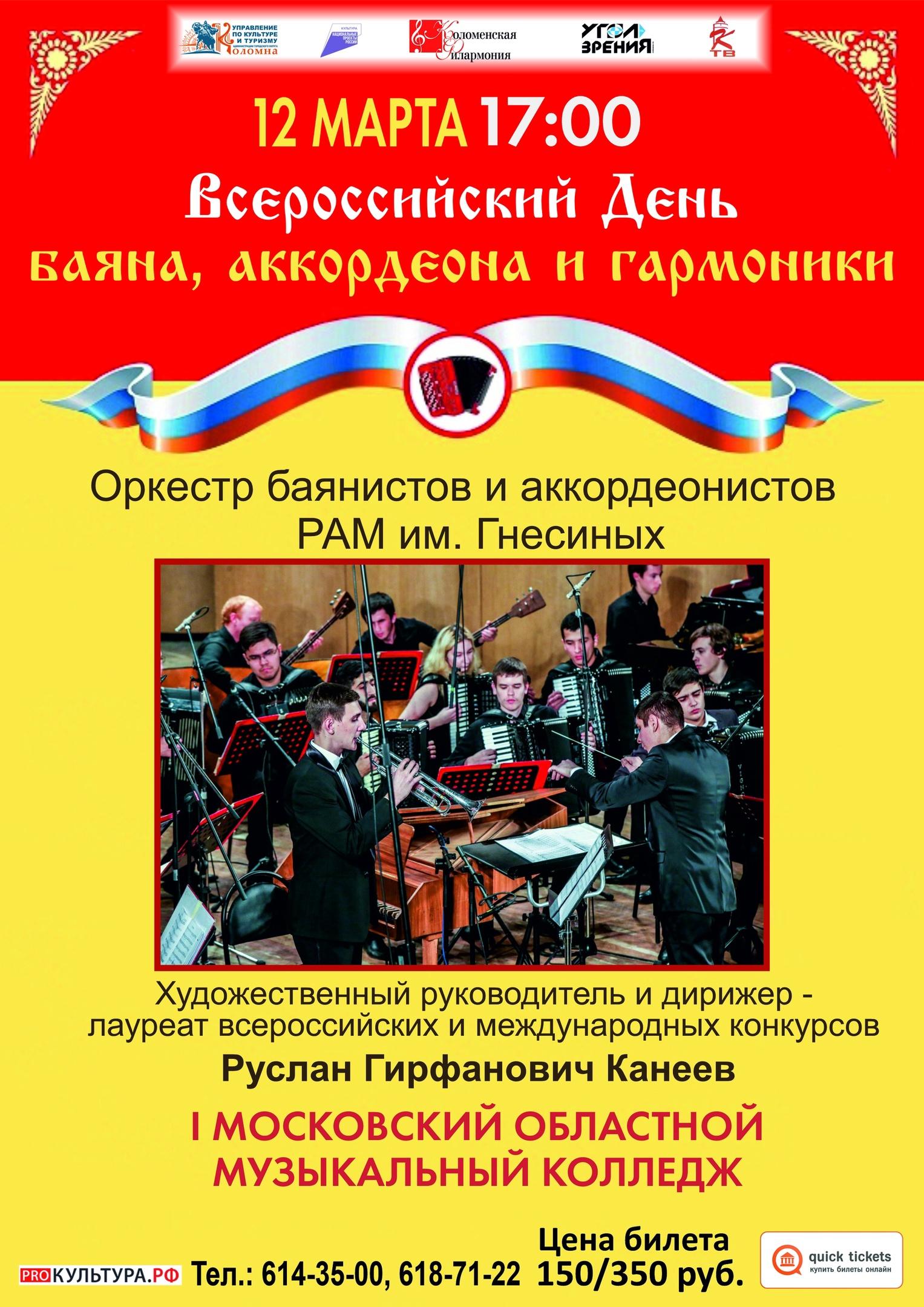 12 марта Коломенская филармония приглашает на концерт, посвящённый Всероссийскому дню баяна, аккордеона и гармоники!