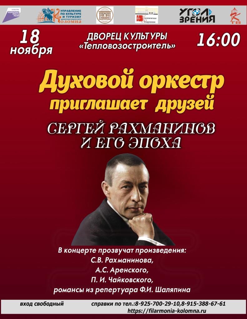 18 ноября в 16.00 ч. Коломенская филармония приглашает на концерт Духового оркестра «Сергей Рахманинов и его эпоха», который состоится во Дворце культуры «Тепловозостроитель».