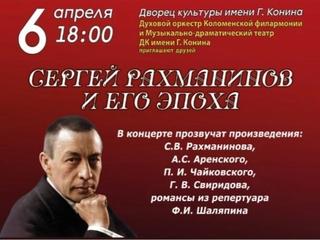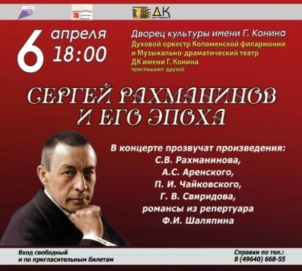 Духовой оркестр Коломенской филармонии и Музыкально-драматический театр ДК им. Г. Конина приглашают Вас на концерт «Сергей Рахманинов и его эпоха».