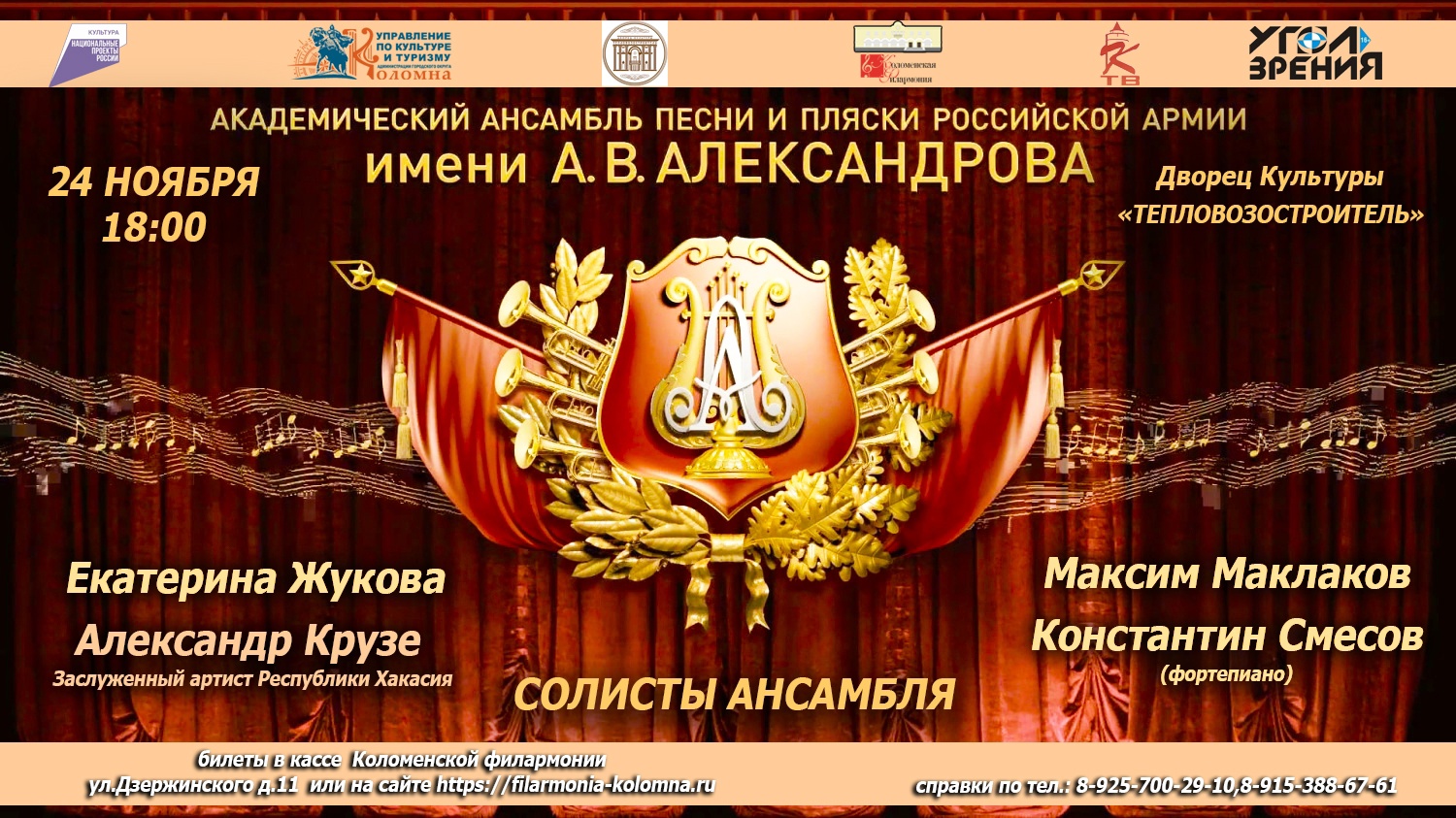 24 ноября в 18.00 ч. Коломенская филармония приглашает на концерт солистов Академического ансамбля песни и пляски Российской Армии имени А.В. Александровна. На сцене ДК "Тепловозостроитель" выступят Екатерина Жукова, Максим Маклаков, Заслуженный артист Республики Хакасия Александр Крузе, Константин Смесов. Вокальную программу украсит яркая хореография.