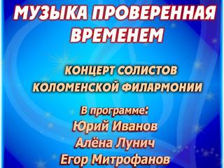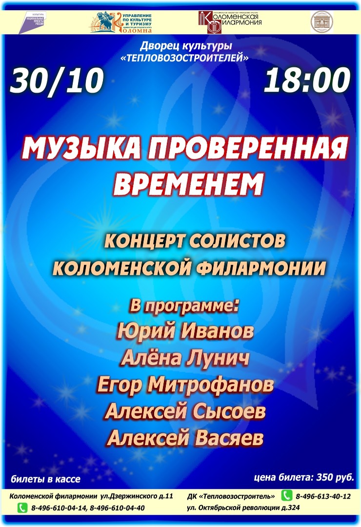30 октября в 18:00 ч. в концертном зале ДК «Тепловозостроитель» состоится концерт солистов Коломенской филармонии «Музыка проверенная временем».
