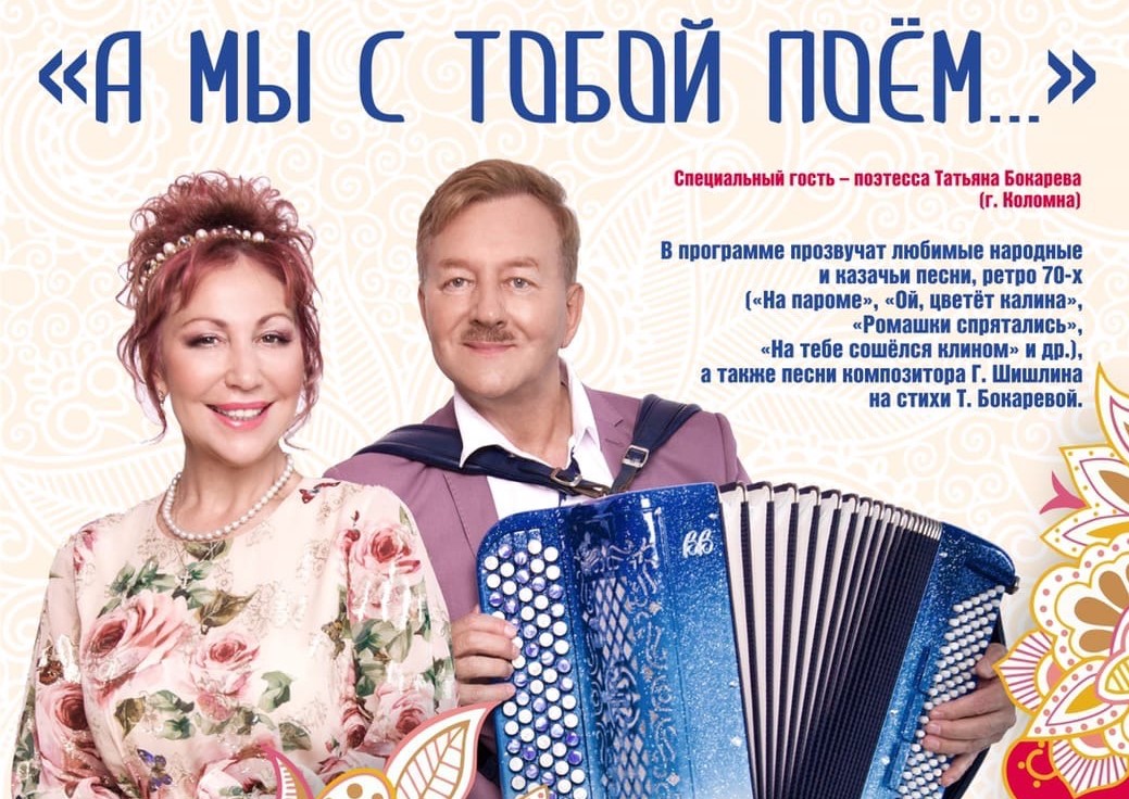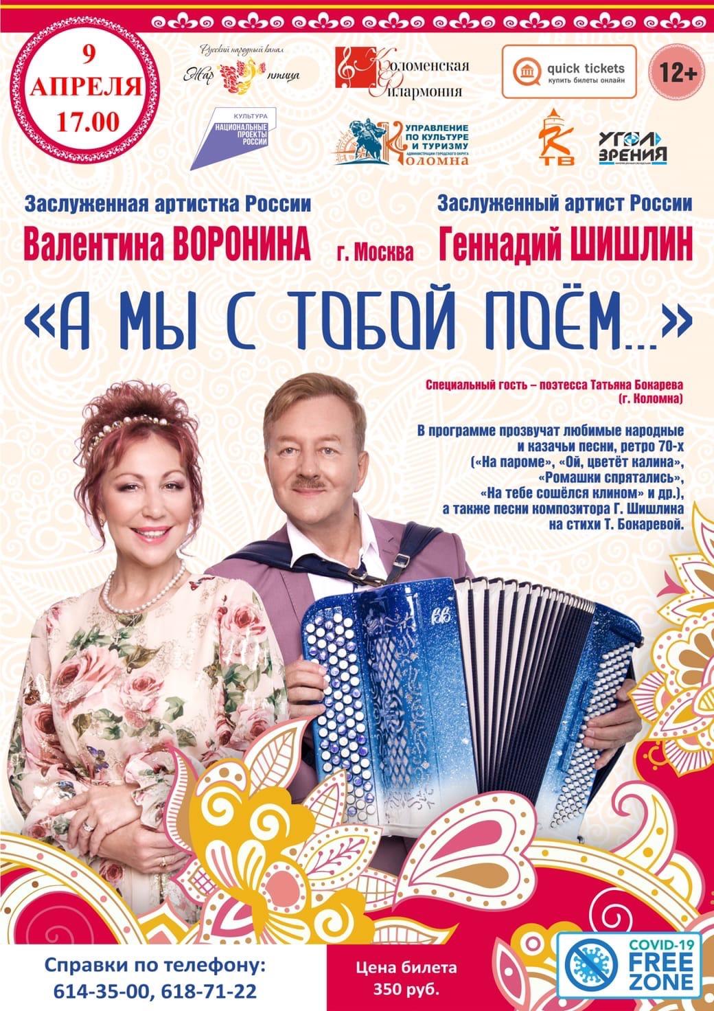 9 апреля в 17.00 ч. Коломенская Филармония приглашает любителей народной песни на концерт Заслуженных артистов России Валентины Ворониной и Геннадия Шишлина.