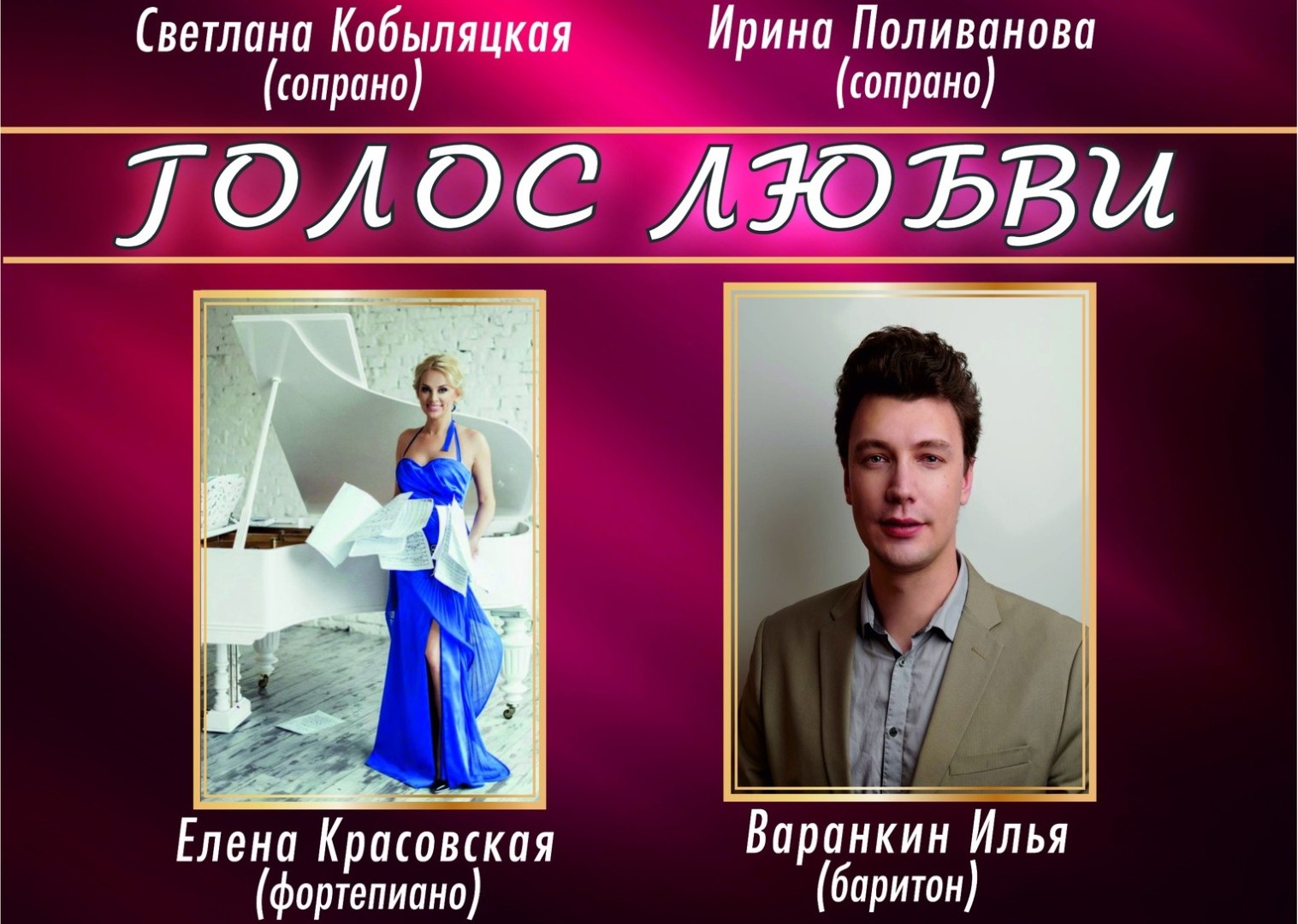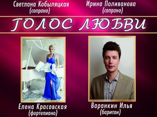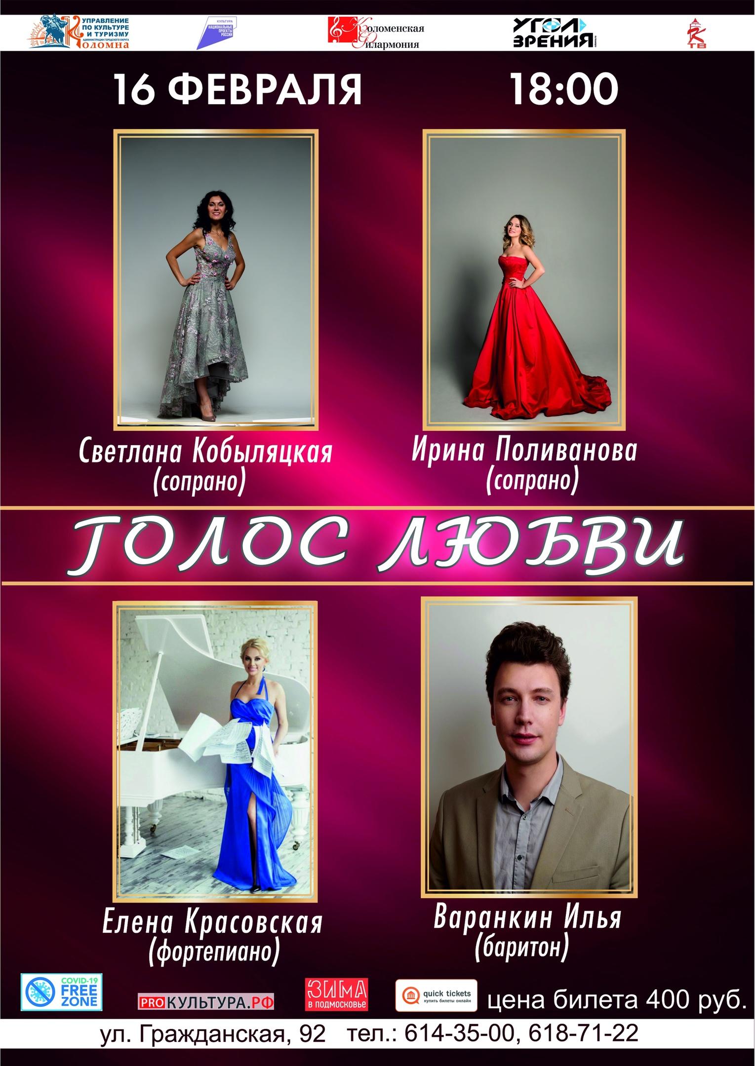 16 февраля в 18.00 ч. Коломенская филармония приглашает погрузится в прекрасную чарующую атмосферу музыкального вечера. Для вас прозвучат известные вокальные произведения великих композиторов в исполнении Лауреатов Международных музыкальных конкурсов: Светланы Кобыляцкой (сопрано), Ирины Поливановой (сопрано), Ильи Варанкина (баритон), Елены Красовской (фортепиано). В концертной программе «Голос любви» собраны жемчужины классической вокальной музыки разных стилей и жанров. Каждый исполнитель постарается передать всю палитру чувства любви к музыке! Музыкальный февральский вечер никого не оставит равнодушным, разожжет в сердце каждого слушателя огонь фантазии и любви! Подарите себе и любимым волшебное настроение и незабываемые впечатления от любви к музыке.