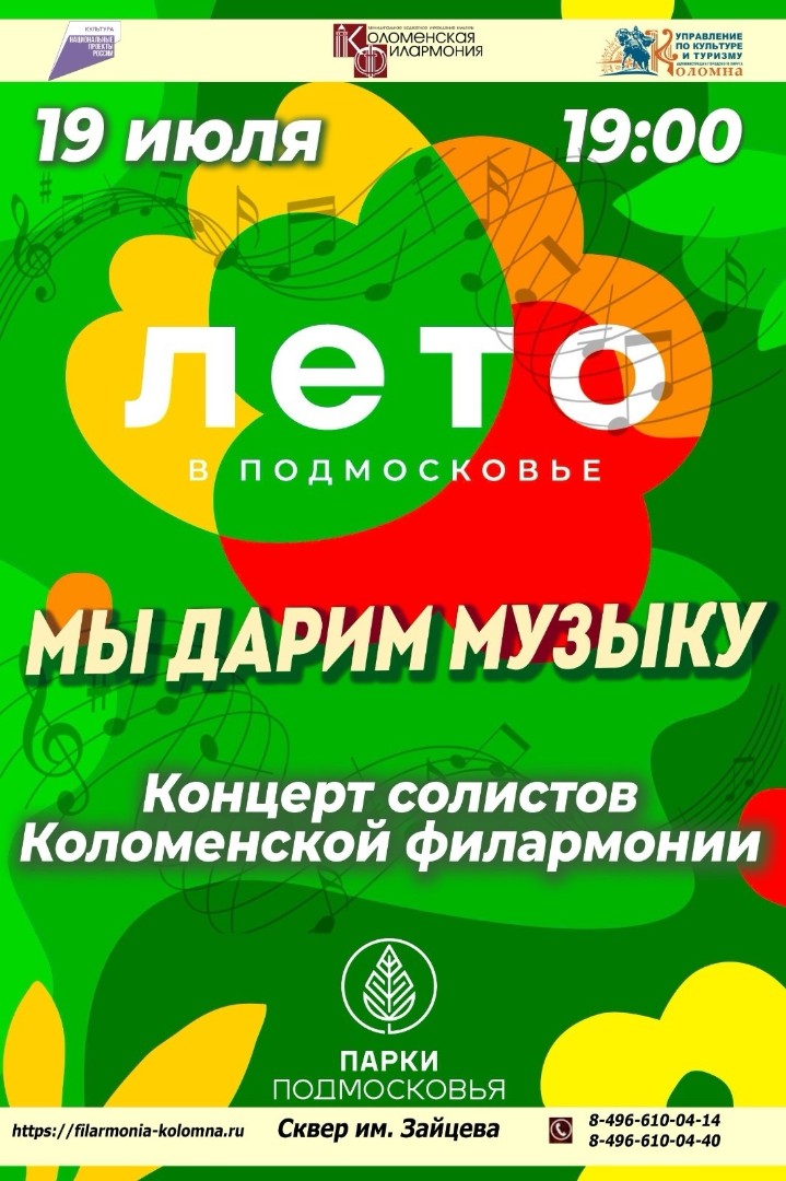 19 июля в 19.00 ч. ждём вас в уютном сквере им. В.А. Зайцева. Концертную программу для вас представят артисты Коломенской филармонии Юрий Иванов И Алёна Лунич. Концерт состоится при благоприятных погодных условиях.