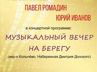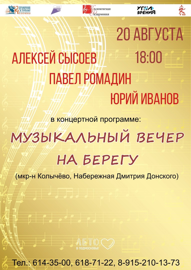 20 августа в 18.00 ч. мы ждем всех любителей музыки на набережной Дмитрия Донского (м-н Колычёво). В концерте примут участие артисты Коломенской филармонии Алексей Сысоев, Павел Ромадин и Юрий Иванов. В программе прозвучат популярные произведения отечественных и зарубежных авторов.