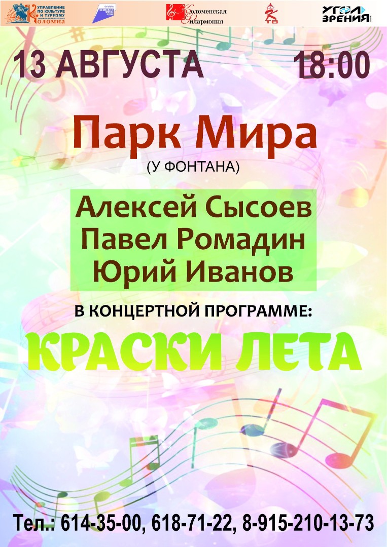 13 августа в 18.00 ч. мы ждем всех любителей музыки у центрального фонтана Городского парка культуры и отдыха "Парк Мира". В концерте примут участие артисты Коломенской филармонии Алексей Сысоев, Павел Ромадин и Юрий Иванов. В программе прозвучат популярные произведения отечественных и зарубежных авторов.
