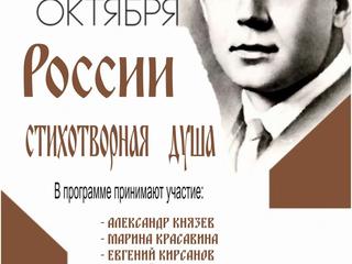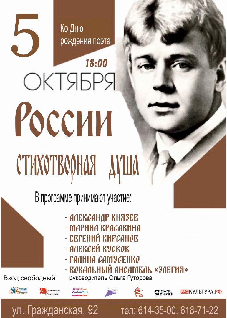 5 октября в рамках Губернаторской программы "Активное долголетие", Коломенская филармония приглашает на литературно-музыкальный вечер «России стихотворная душа», посвящённый дню рождения Сергея Есенина.