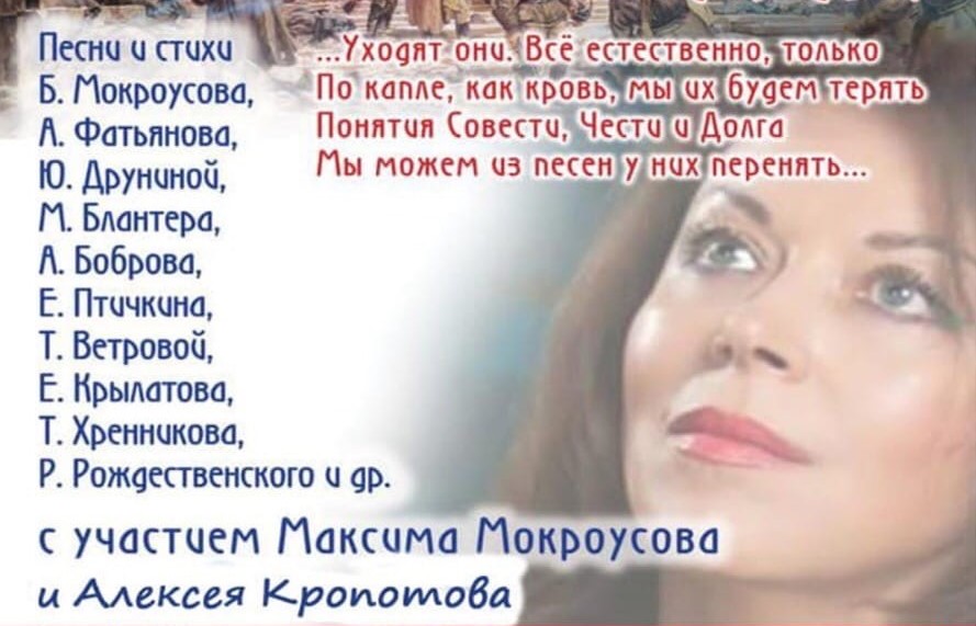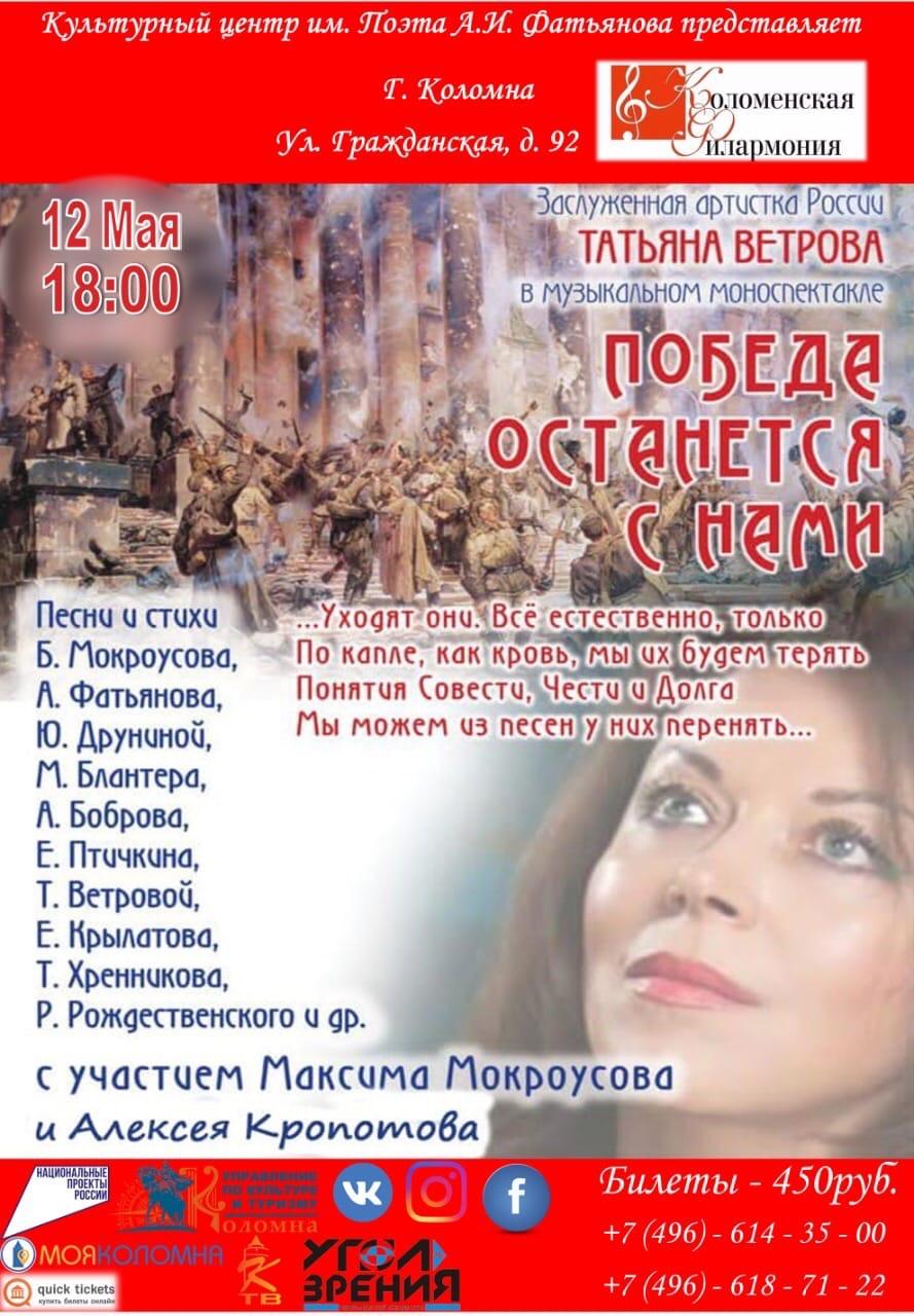 12 мая в 18.00 ч. Коломенская филармония приглашает на моноспектакль Заслуженной артистки России, певицы и поэтессы Татьяны Ветровой "ПОБЕДА ОСТАНЕТСЯ С НАМИ".