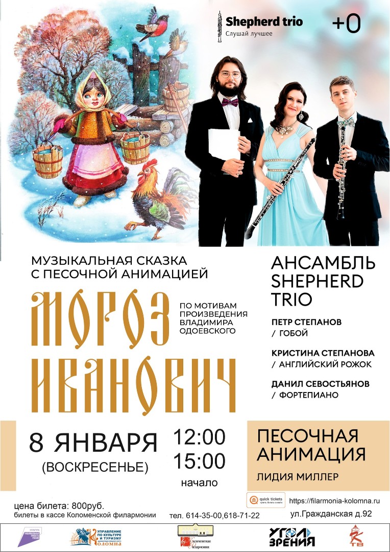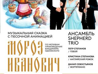 «Мороз Иванович» - одно из лучших произведений В.Ф. Одоевского для детей. Премьера музыкальной зимней сказки «Мороз Иванович» подготовлена талантливыми музыкантами «SHEPHERD TRIO». Художественное слово – артист драматического театра и кино, Сергей Степанов. В составе ансамбля «Shepherd trio» - лауреаты всероссийских и международных конкурсов, выпускники Московской государственной консерватории. Песочная анимация в исполнении Лидия Миллер.