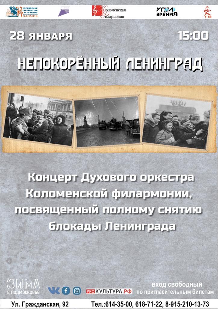 28 января в 15.00 на сцене Коломенской филармонии состоится концерт Духового оркестра «Непокорённый Ленинград».