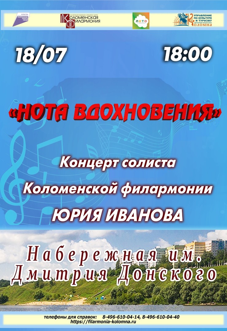 18 июля в 18:00 ч. состоится концерт артиста Коломенской филармонии Юрия Иванова. В профессиональных руках музыканта волшебные струны гитары звучат завораживающе. Не откажите себе в удовольствии провести время на берегу Оки в чудесной музыкальной атмосфере.