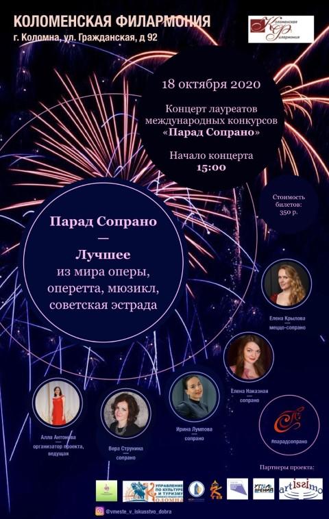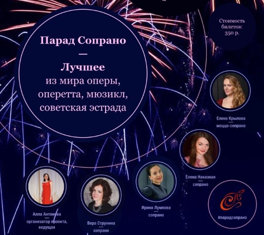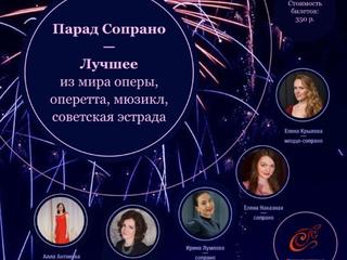 «Парад сопрано» – молодые артистки, выпускники ведущих московских музыкальных ВУЗов и солистки московских и подмосковных музыкальных театров. Все артисты проекта - лауреаты российских и международных конкурсов. В классической музыке «сопрано» - это голос, которому подвластны высокие ноты и высокие чувства. Певиц проекта объединяют возможности женского голоса, который передает разные состояния, – и нежную лирику, и драматический накал страстей, и спокойную безмятежность. В программе концерта прозвучат лучшие произведения из мира классической музыки: знаменитые арии из опер, фрагменты из оперетт и мюзиклов, а также любимые мелодии советской эстрады.