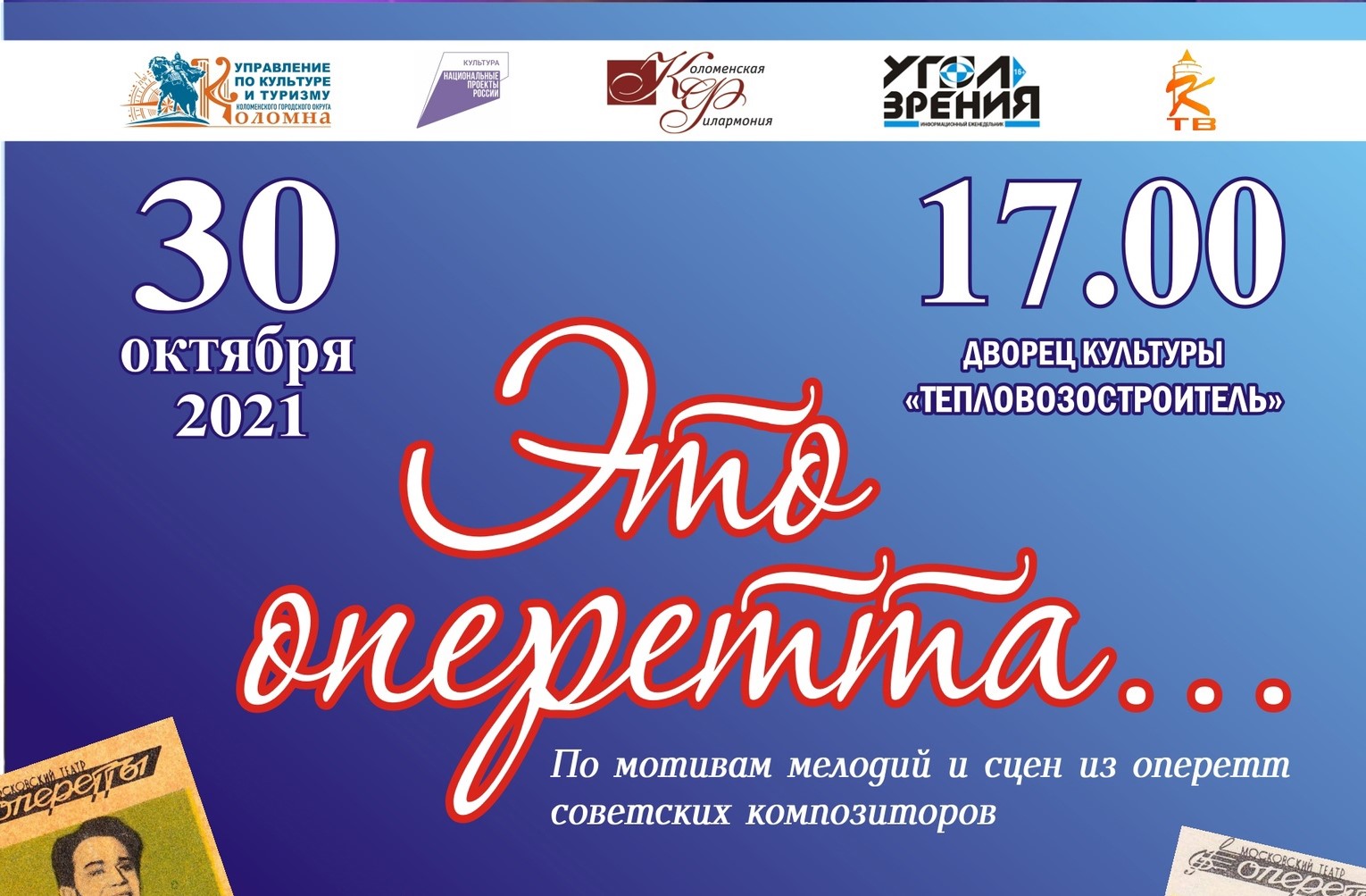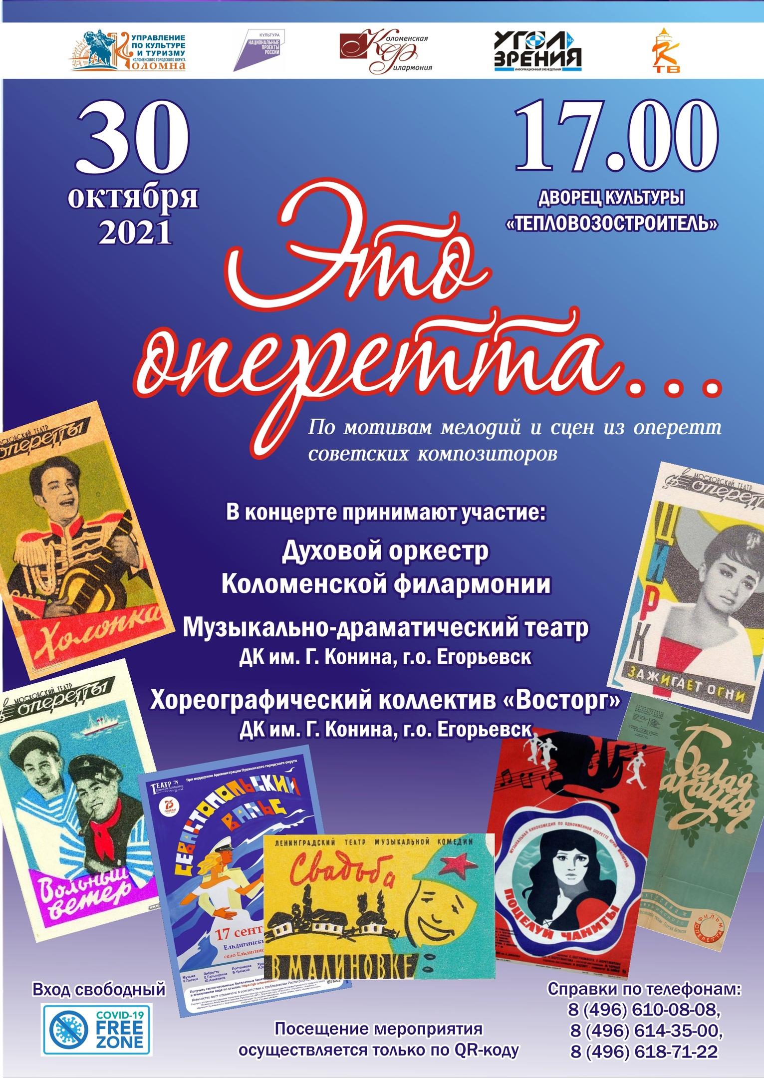 30 октября в 17.00 ч. мы рады пригласить уважаемую публику на премьерный показ программы Духового оркестра Коломенской филармонии "Это оперетта...". Автор и идейный вдохновитель проекта заслуженный работник культуры РФ, главный дирижёр Духового оркестра Александр Пономарев. В концерте примут участие: солисты музыкально – драматического театра ДК им. Г. Конина г.о. Егорьевск, руководитель и режиссер театра Александр Дорогов, а также хореографический коллектив «Восторг» ДК им. Конина г.о. Егорьевск, руководитель Елена Мохова.