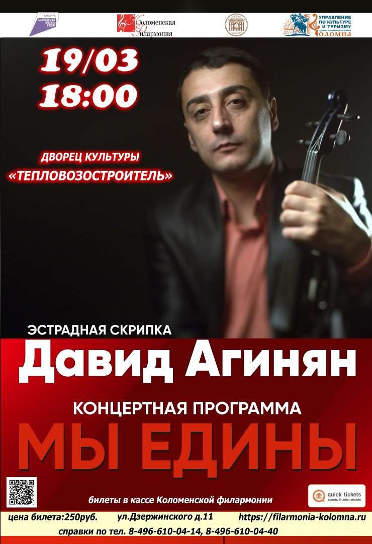 19 марта в 18.00 ч. Коломенская филармония приглашает на концерт в ДК "Тепловозостроитель". Для коломенской публики выступит скрипач-виртуоз из Новосибирска Давид Агинян с программой "МЫ ЕДИНЫ".