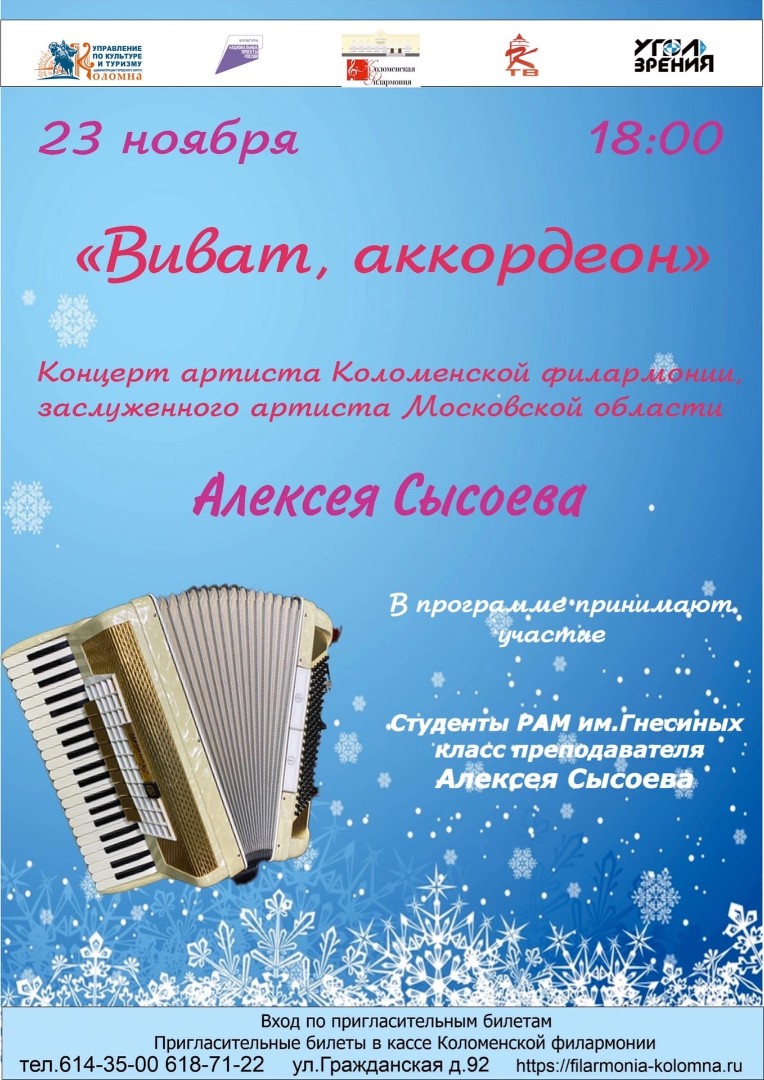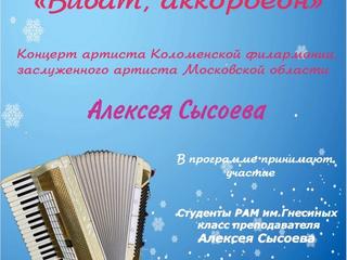 23 ноября в 18.00 ч. состоится концерт артиста Коломенской филармонии, заслуженного артиста Московской области Алексея Сысоев. Алексея хорошо знают в Коломне и далеко за пределами города. Артист много гастролирует, реализует музыкальные проекты, преподаёт. В программе «Виват, аккордеон» приму участие ученики Алексея Вячеславовича.
