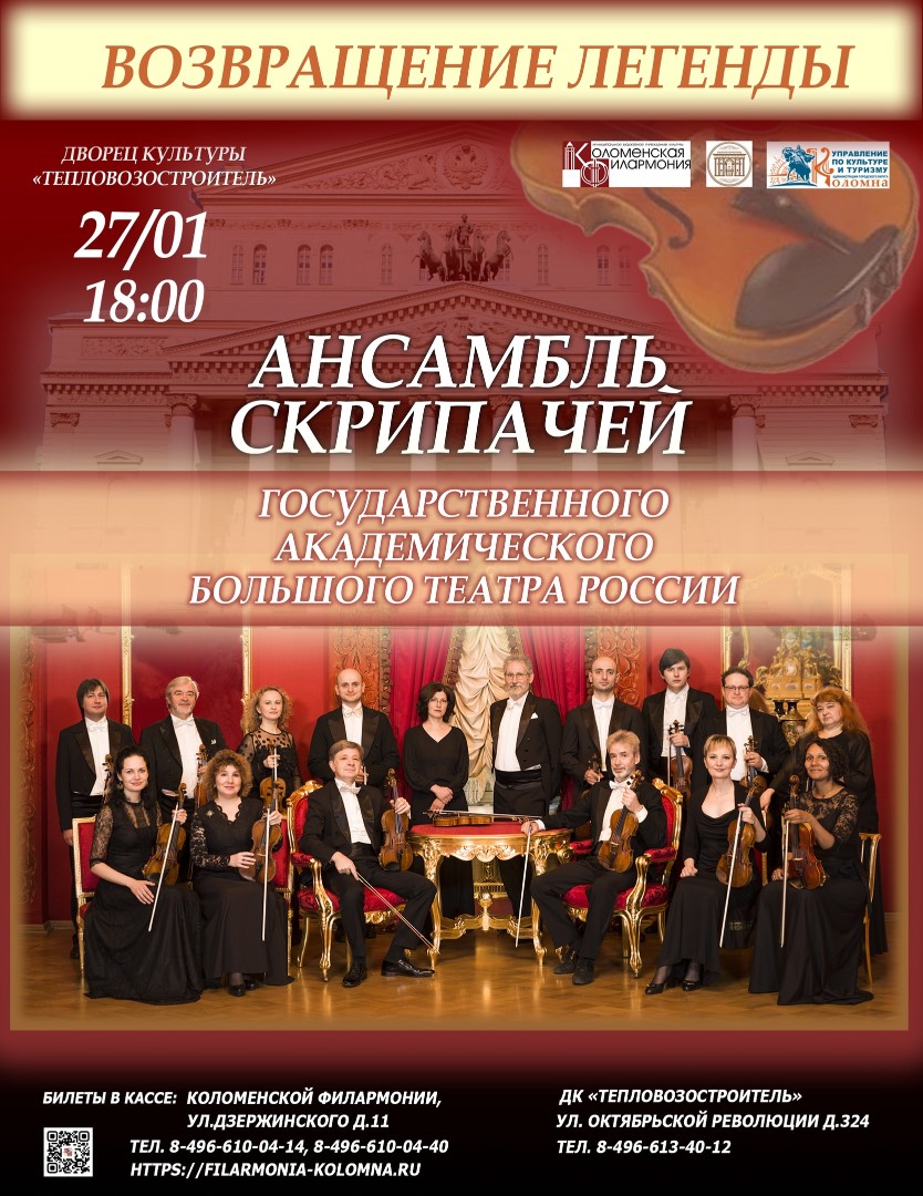 27 января в 18:00 ч. по приглашению Коломенской филармонии на сцене ДК "Тепловозостроитель" выступит ансамбль скрипачей Большого театра России с программой «Возвращение легенды».