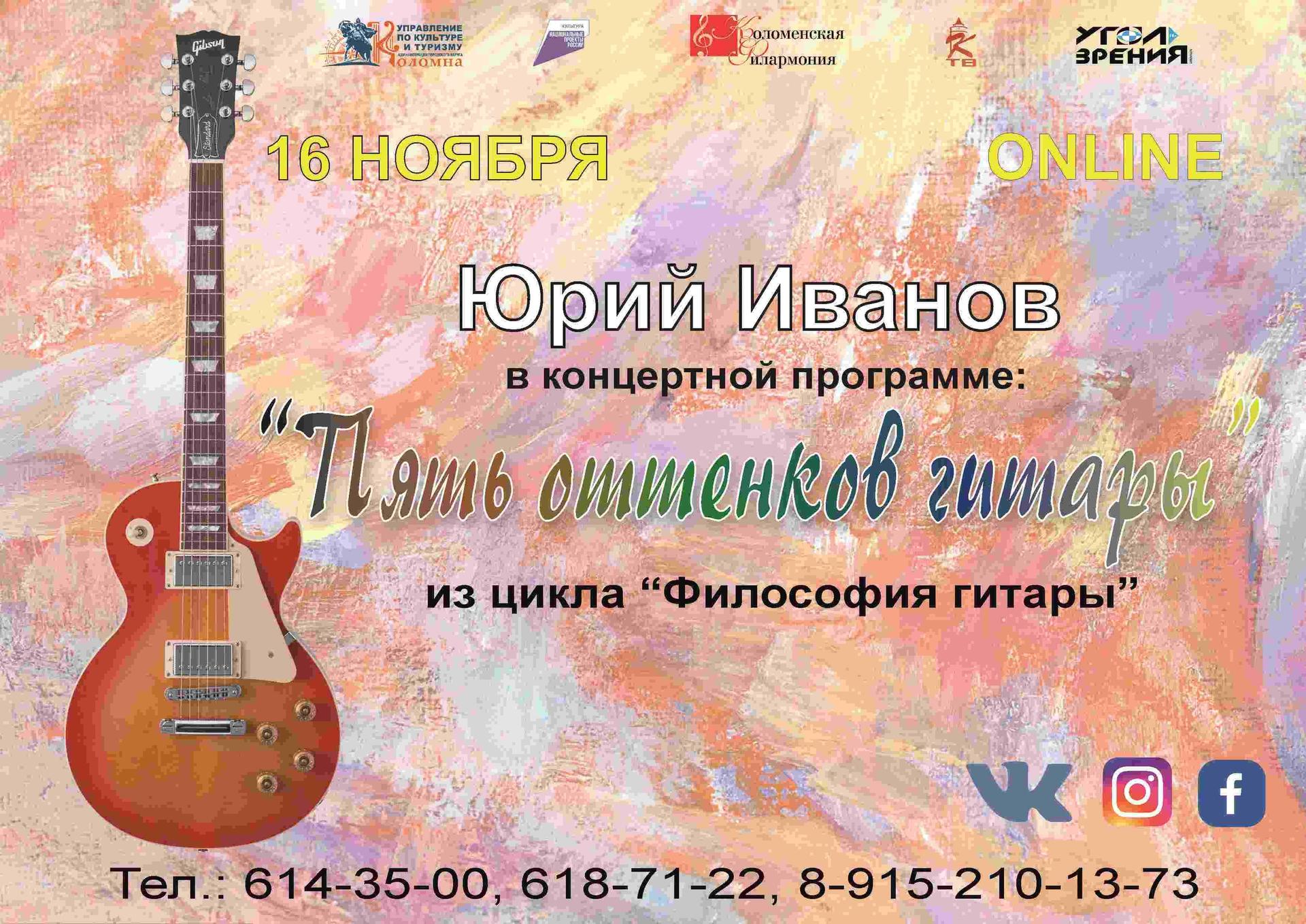 Коломенская филармония продолжает цикл программ «Философия гитары» и приглашает 16 ноября на очередную встречу с душевным и близким каждому человеку музыкальным инструментом – гитарой. В исполнении артиста Коломенской филармонии Юрия Иванова прозвучат произведения разных композиторов и направлений.