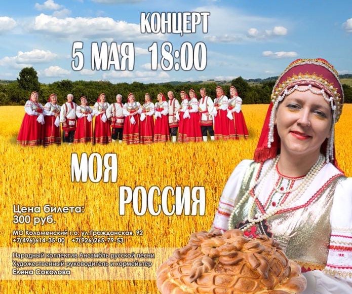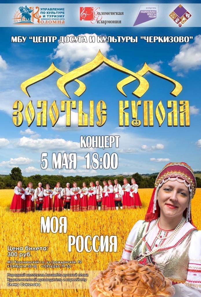 5 мая 18.00 ч. Коломенская филармония приглашает на концерт «Моя Россия». С сольной программой выступит Лауреат Международных и Всероссийских конкурсов Народный коллектив "Ансамбль русской песни "Золотые купола". Коллектив более 30 лет радует зрителей своим творчеством и во все времена на сцене блистают исполнители с уникальными голосами, которым аккомпанируют виртуозные талантливые музыканты.