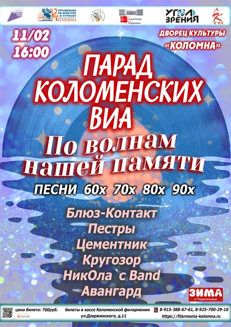 Дорогие друзья, спешим вам сообщить, что 11 февраля в 16.00 ч. на сцене ДК "Коломна" состоится традиционный Парад Коломенских ВИА. Как всегда вас ожидает встреча с любимыми коллективами: ВИА "ДК Цементник", ВИА "Авангард", ВИА "Кругозор", Блюз-Контакт, ВИА "Пестры" и ВИА "НикОла ‘с Band". Коломенская филармония приглашает вас на концерт "По волнам нашей памяти". Время понастальгировать!