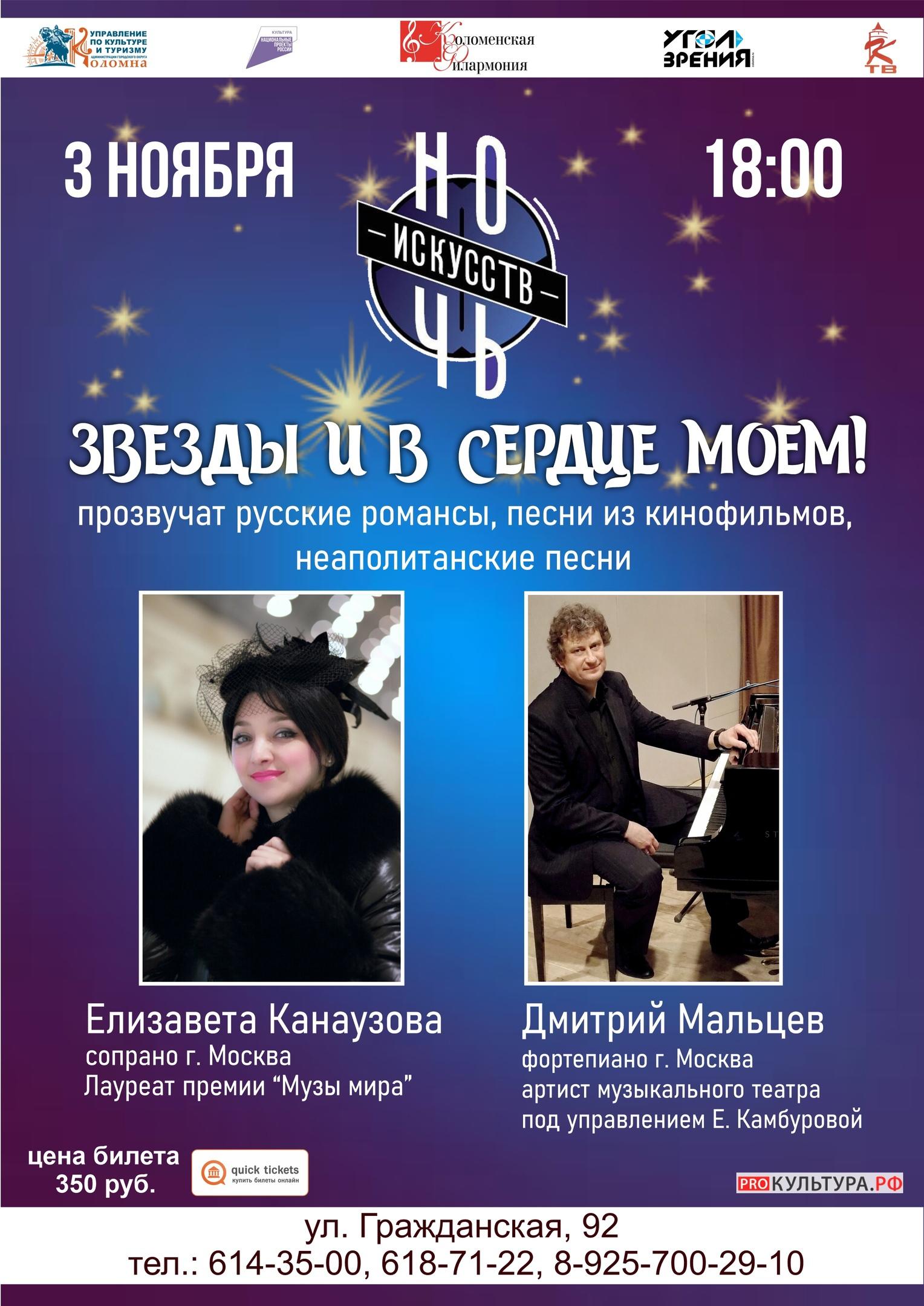 3 ноября 18:00 ч. в Коломенской филармонии состоится концерт в рамках Всероссийской акции "Ночь искусств". На сцене филармонии выступит Лауреат международного конкурса под патронажем С. Бэлза "Музы мира", фестивалей под патронажем В. Спивакова и Д. Мацуева "Вдохновение" и "Primavera classica", приглашённая артистка президентского симфонического оркестра Елизавета Канаузова.
