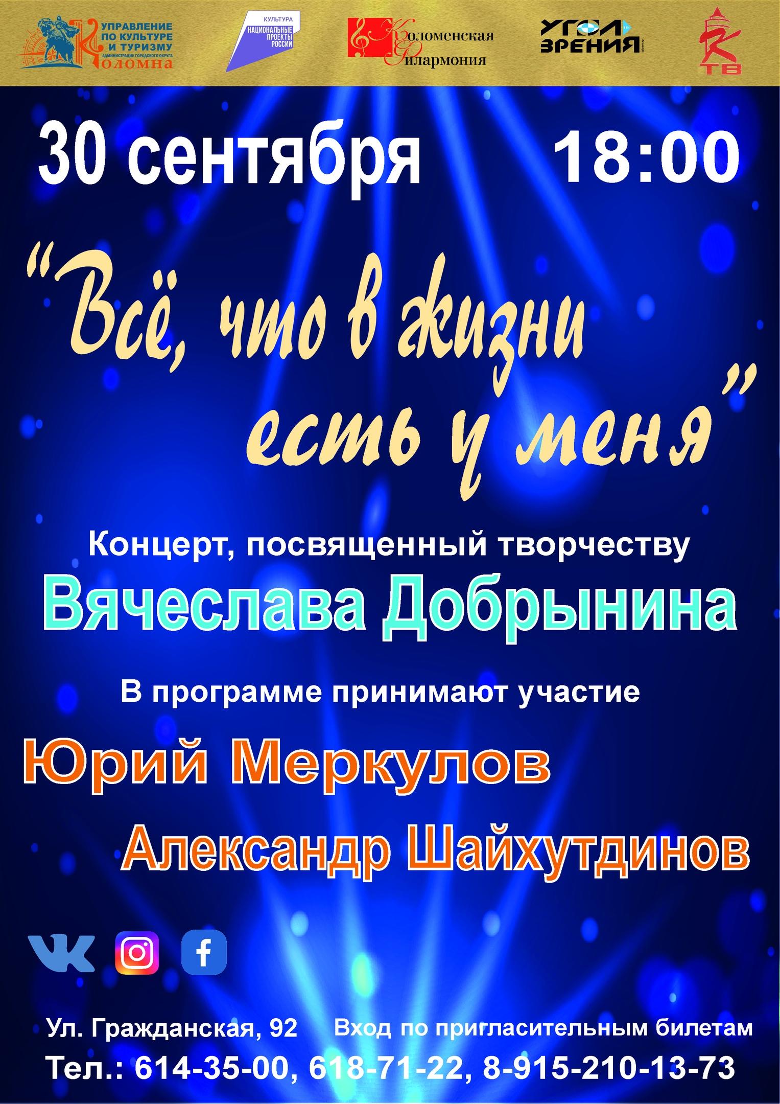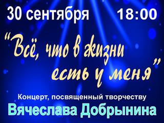 30 Сентября в 18.00 ч. состоится концерт, посвященный творчеству Вячеслава Добрынина. Услышать хиты композитора можно будет в исполнении Юрия Меркулова и Александра Шайхутдинова.
