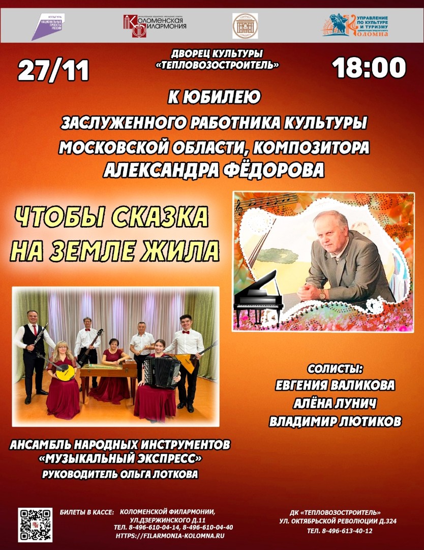 27 ноября в 18:00 ч. Коломенская филармония приглашает в ДК "Тепловозостроитель" на юбилейный концерт посвящённый, творчеству заслуженного работника культуры Московской области Александра Фёдорова.