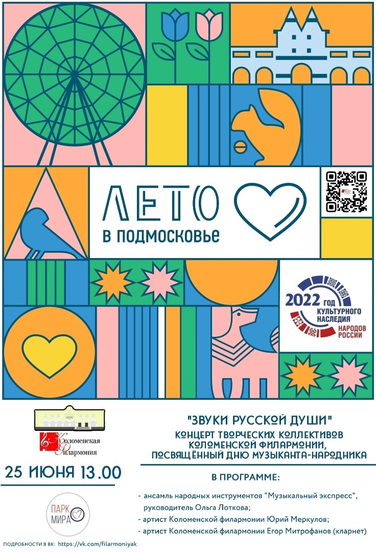 25 июня в 13.00 Коломенская филармония приглашает вас в Городской парк культуры и отдыха «Парк мира» на концерт, который посвящён международному Дню музыканта-народника.