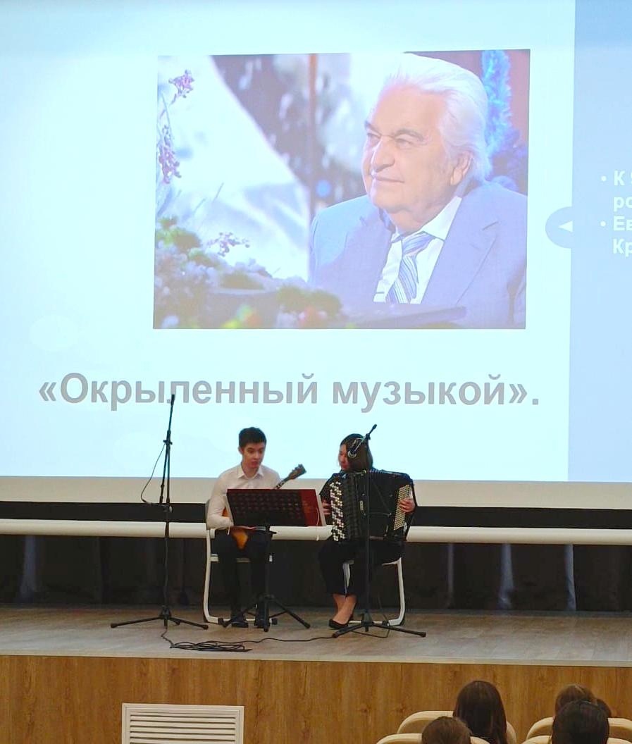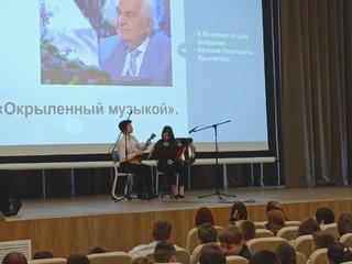 Ребята познакомились с биографией и творческим путём Евгения Крылатова, творчество которого знают и любят слушатели всех возрастов. Узнали, что за свою жизнь он написал более 160 мелодий к художественным фильмам и мультфильмам, ставшим признанными шедеврами кинематографа. Этим он навсегда оставил след в культуре и истории. В ходе мероприятия прозвучали незабываемые лирические и задушевные произведения одарённого талантом композитора: «Крылатые качели», «Колыбельная медведицы», «До чего дошел прогресс», «Музыка», «Прекрасное далеко».