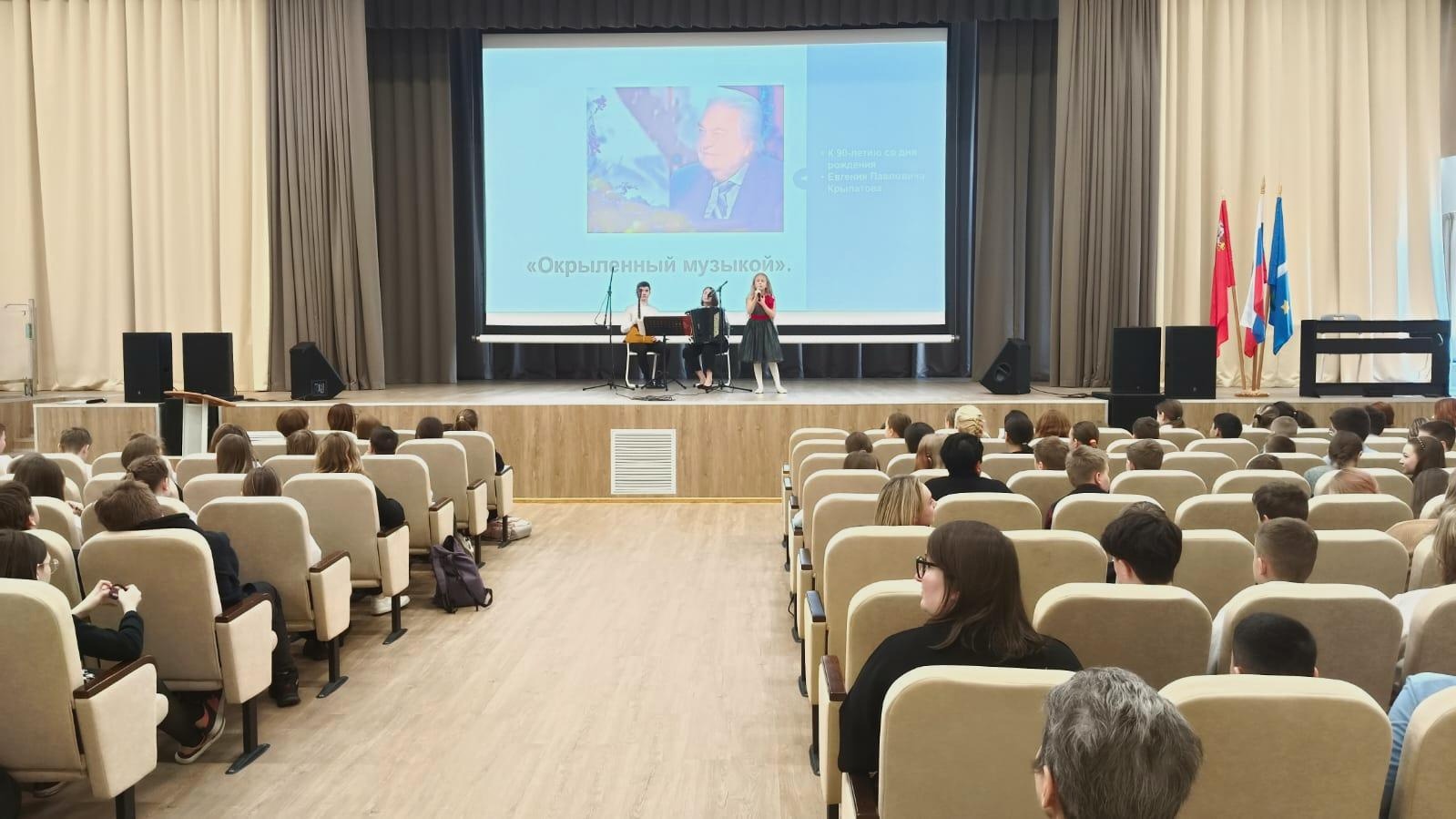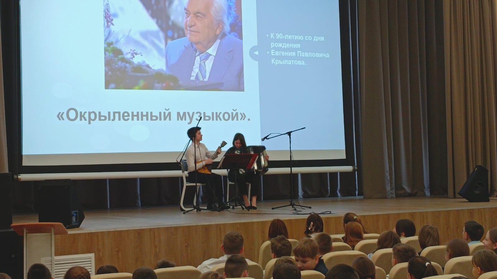 28 февраля 2024 года для учащихся 5-х, 6-х классов МБОУ СОШ №21 состоялась литературно-музыкальная программа «Окрылённый музыкой», посвященная 90-летию композитора Евгения Петровича Крылатова, в рамках музыкально-образовательного проекта социального партнерства МБУК «Коломенская филармония» и МБУ ДПО УМЦ «Коломна» по художественно-эстетическому воспитанию школьников «Читаем с музыкой». Мероприятие прошло при участии и сопровождении артистов Коломенской филармонии солистов ансамбля народных инструментов «Музыкальный экспресс» Марии Павловой и Виктора Новикова, исполнении песен воспитанников АНО ДО «Центр развития культуры и искусств «Дарование», руководитель Ирина Николаевна Ильина, активном участии и организации мероприятия Юлии Сергеевны Щегловой, заведующей информационно-библиотечного центра МБОУ СОШ № 21.