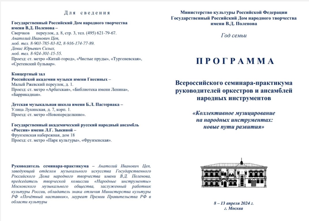 Дирижёр и руководитель ансамбля народных инструментов "Музыкальный экспресс" Ольга Евгеньевна Лоткова, принимает участие в семинаре-практикуме руководителей оркестров и ансамблей народных инструментов. Данный семинар позволяет наладить новые творческие связи, расширить репертуар и выявить новые формы работы с коллективом. Семинар проходит на базе Государственного Российского Дома народного творчества им. В.Д. Поленова.