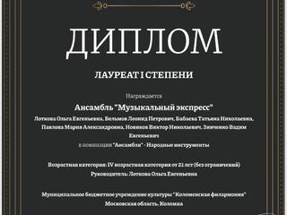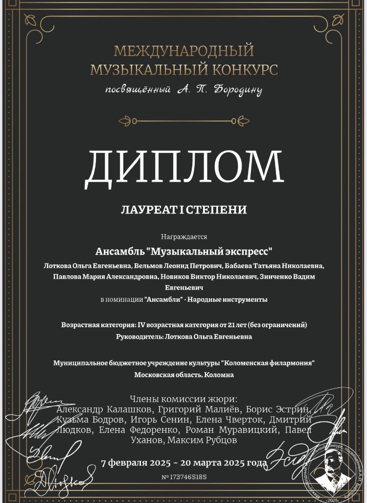 Стали известны результаты Международного музыкального конкурса им. А.П. Бородина. Ансамбль народных инструментов "Музыкальный экспресс" Коломенской филармонии стал Лауреатом I степени среди профессиональных коллективов.