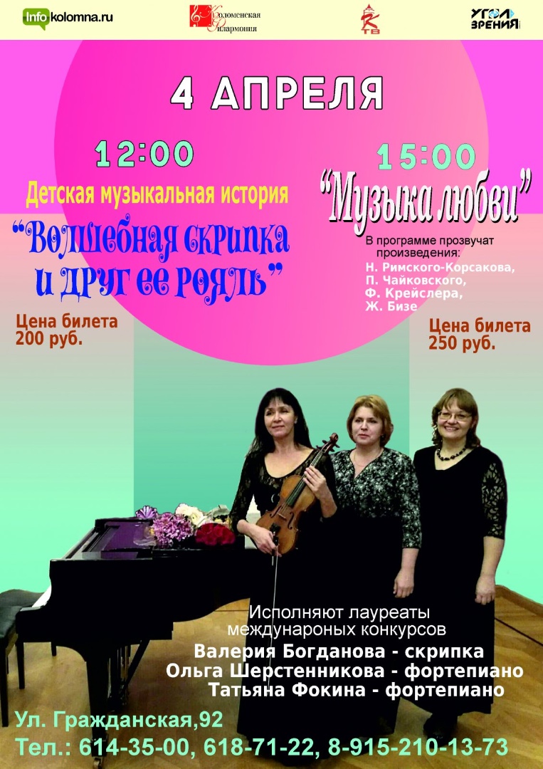 25 апреля Коломенская филармония приглашает сразу на два концерта В 12.00 ч. мы ждём наших юных зрителей на музыкальную историю "Волшебная скрипка и друг её рояль". В 15.00 ч. для взыскательной публики прозвучат произведения Н. Римского-Корсакова, П. Чайковского, Ж. Бизе и других гениев музыкального искусства. Справки по телефону 614-35-00, 618-71-22. Адрес: ул. Гражданская, дом 92.