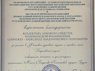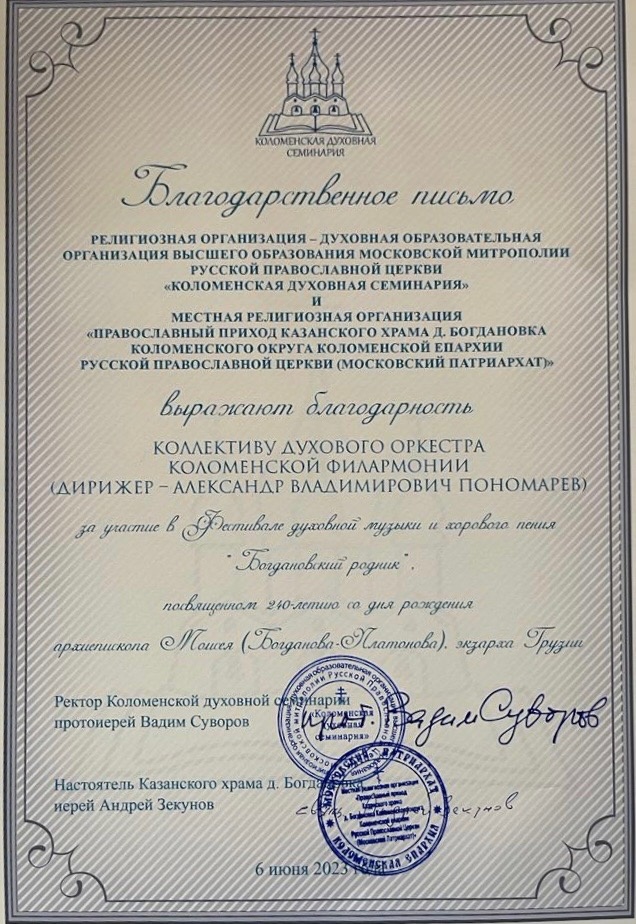 6 июня Духовой оркестр Коломенской филармонии, под управлением главного дирижера заслуженного работника культуры РФ Александра Пономарева, принял участие в Фестивале духовной музыки и хорового пения «Богдановский родник», посвященном 240-летию со дня рождения Архиепископа Моисея (Богданова-Платонова), экзарха Грузии.