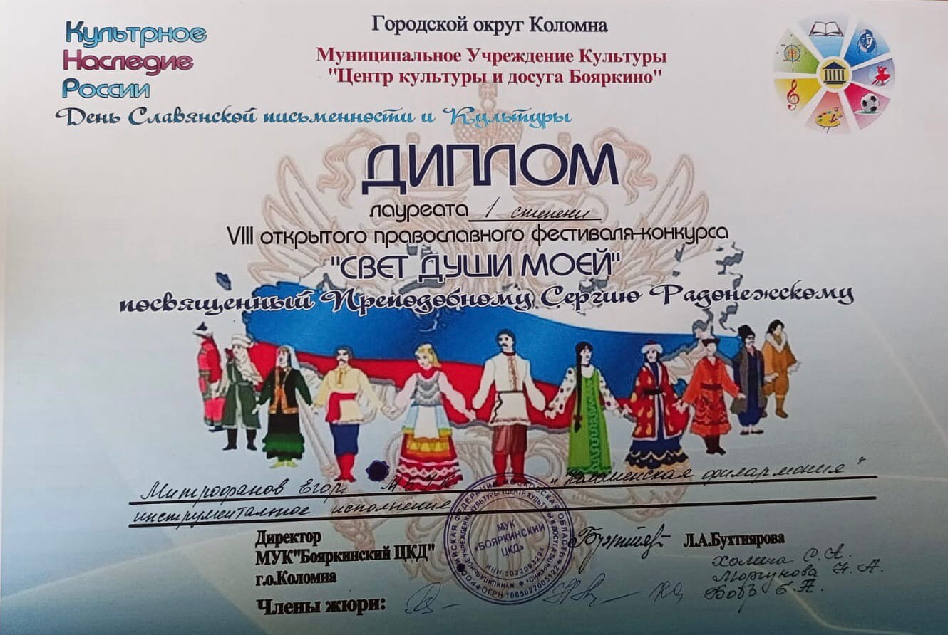 21 мая артист Коломенской филармонии Егор Митрофанов принял участие в фестивале-конкурсе «Свет души моей» в номинации инструментальное исполнение. Поздравляем Егора Юрьевича со званием Лауреата I степени.