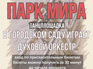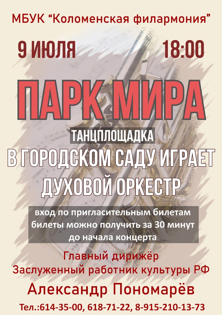 9 июля в 18.00 ч. Коломенская филармония приглашает на концерт Духового оркестра, который состоится на Танцевальной площадке в городском парке культуры и отдыха "Парк Мира". Вход на концерт по пригласительным билетам, которые можно получить за 30 минут до начала программы.